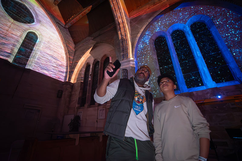 In a 2023 study at Jefferson, students created an immersive art experience in the campus chapel to calm fellow students and neurodiverse individuals. Based on research on healing imagery, different nature themes were used for the video content to fill the chapel with projection mapping. A soundtrack was designed to create a more multi-sensory experience.